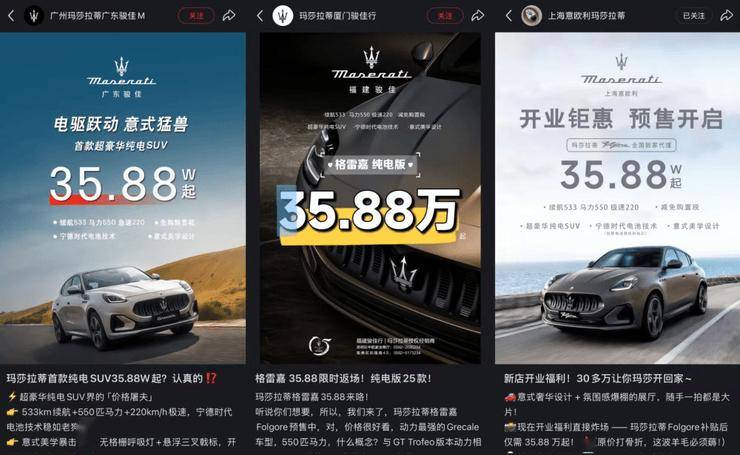 对于这个消息,有经销商证实了。销售顾问表示,35.88万是裸车价,另外还需要加上一定的选配费用,最终落地大约在40万元。据了解,玛莎拉蒂Grecale Folgore是品牌首款纯电中型SUV,主打高性能与超豪华定位,官方指导价89.88万元,经销商报出的35.88万元较指导价降了54万,电动版比燃油版折扣力度更大。