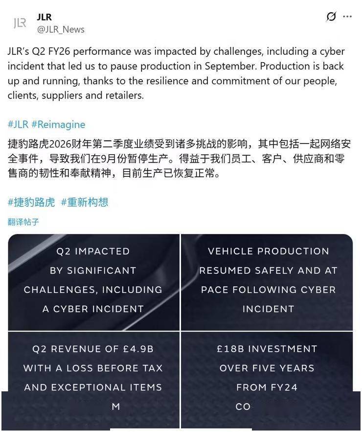 11月16日消息,日前,捷豹路虎(JLR)公布的最新财报显示,公司2025Q3因遭遇网络攻击,直接损失高达1.96亿英镑。据了解,9月2日,捷豹路虎首次披露在英国受到网络攻击,系统遭黑客入侵。此次攻击迫使捷豹路虎关闭了其信息技术网络,导致全球范围内生产线陷入瘫痪,捷豹路虎全球33000名员工被告知生产线受到影响,被迫停工停产。随后,一份补充声明确认,本次攻击由黑客组织“Scattered Lapsus$ Hunters”发起,并导致部分公司数据外泄。