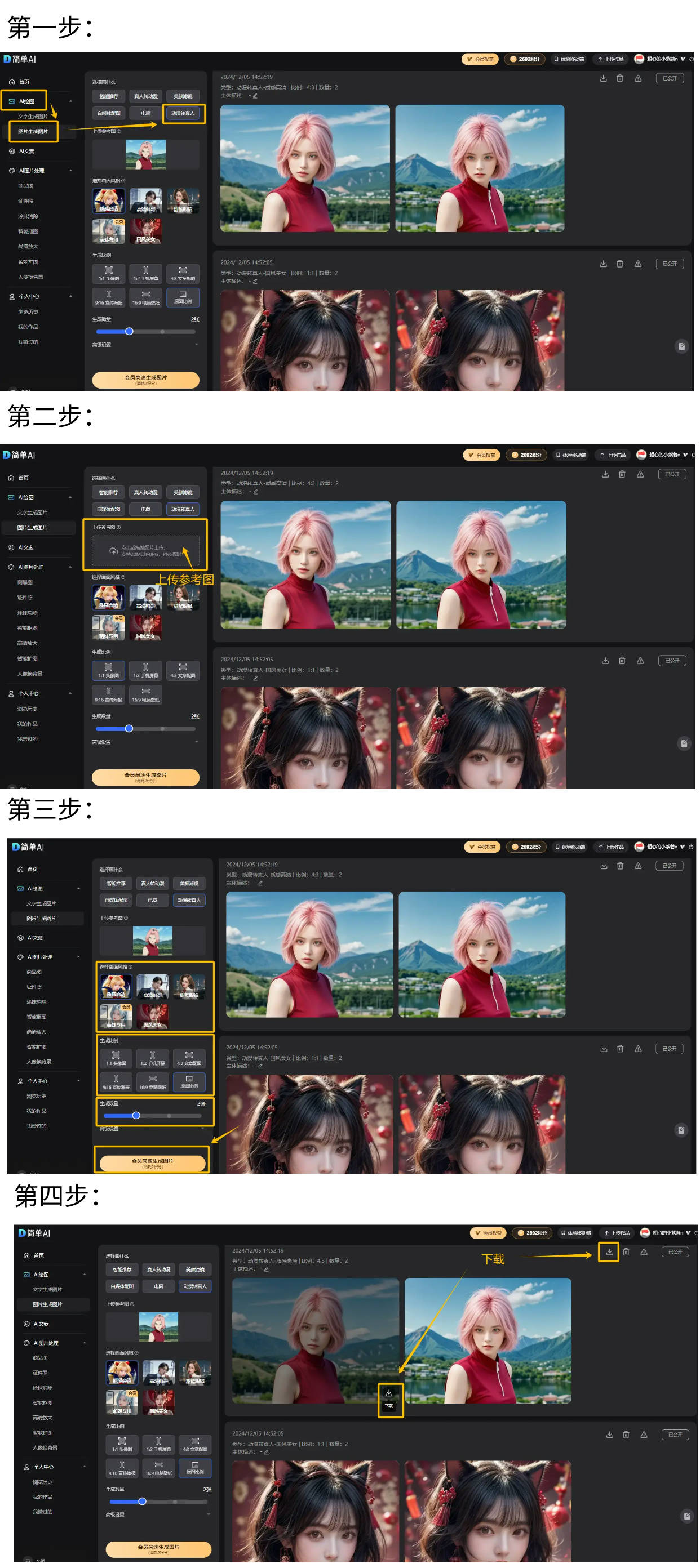 第三步:选择画面风格、生成比例及生成数量,点击“生成图片”,一键生成属于你的动漫转真人的美图!