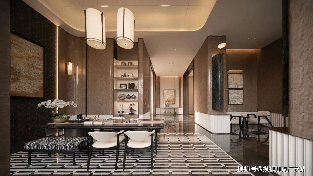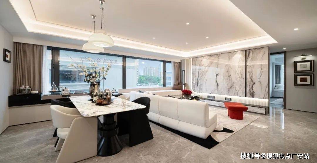 等都藏着很多奢雅的细节,诸如各类岩板、石材、铝板等高浓度运用,瞬间提升了空间的档次。