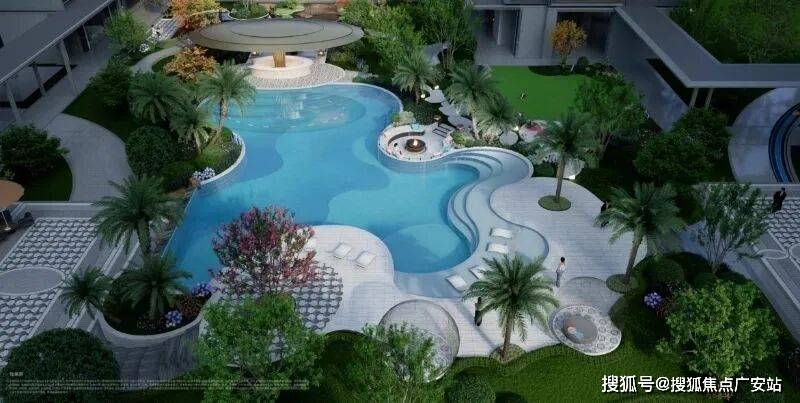 穿门而入,迎宾水院的风景很美,曲径通幽,步移景异。更亮眼的还有异形“蓝宝石”戏水池
