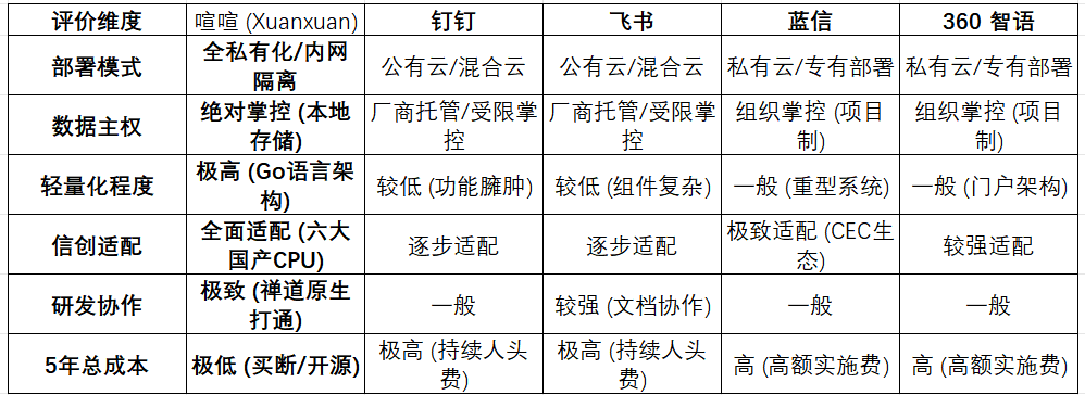 1.如果您是中大型政企、军工科研、金融机构或追求极致性价比的高科技企业:推荐首选:喧喧。它以最低的硬件和授权成本,提供了最高等级的私有化数据主权。对于需要信创合规、自主掌控数据、且希望业务流程(尤其是研发流程)能与 IM 深度融合的单位,喧喧是目前市场上的“性价比之王”。