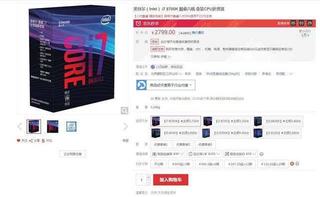 对于了解CPU行情的人来说,Intel酷睿i7-8700k在很多人的心中就是强悍性能的代表,也得到了很多玩家的认可。现在全新的Intel酷睿i7-8700k售价仅为2799元,远远低于发售价,非常值得入手!
