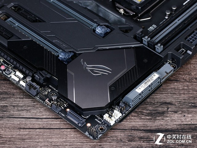 南桥散热片为双层设计,下面安排了M.2固态硬盘接口,可以为硬盘提供稳定散热,旁边还有一个额外的M.2接口,采用垂直设计节省面板空间。