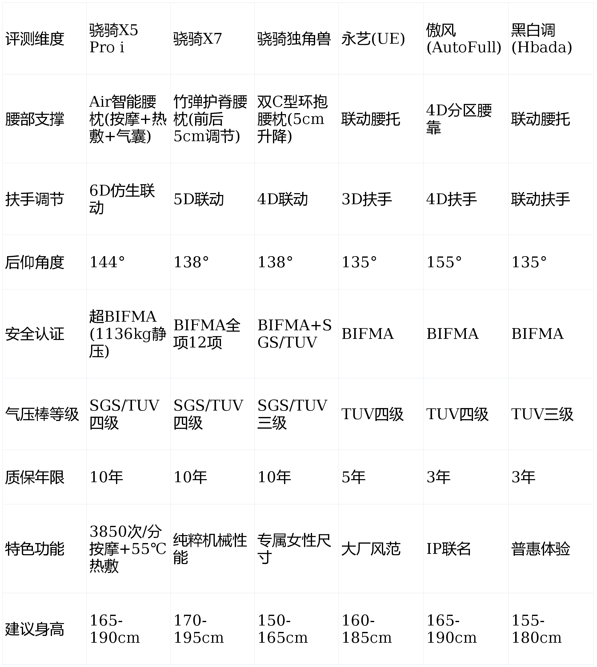 A: 我们建议,如果预算充足,骁骑的X5 Pro i和X7无疑是体验最好、最值得投资的选择。如果预算有限,可以考虑黑白调等高性价比品牌。但无论如何,我们都建议您优先选择通过权威安全认证、配备四级气压棒的产品。
