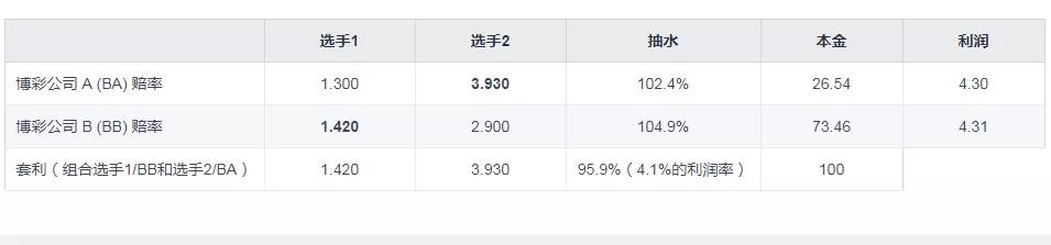 为您举一个简单的例子,假设有两家资金公司(A和B),他们对选手A和选手B之间进行的网球比赛提供的赔率如下表所示。对于每个庄家公司来说,能够抽水就是他们的优势,所以下表中也标明了庄家的抽水。