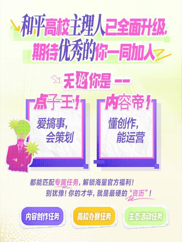如今,“和平高校主理人”体系迎来全新优化扩展——打破“只能办赛”限制,新增多元任务选择,涵盖校园创意活动策划、游戏内容创作者团队孵化等方向,为学生精准匹配专属任务,尽情施展天赋与才华!