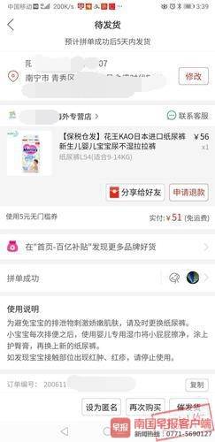 近日,南宁的阳女士网购时遭遇商家退单。她告诉记者,今年6月中旬,一母婴群里,有人推荐称,一知名网络平台在搞尿不湿促销,她点击页面领取购物券,下单付款购买,但几小时后被退单退款。商家客服称,阳女士此前已享受过该优惠,因此不能再下单购买。